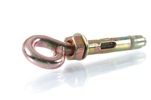 Анкер с рым-болтом (анкер-кольцо). Анкер с кольцом используется для натяжки такелажного оборудования. Кольцевой анкер устанавливается в предварительно просверленное отверстие в полнотелом материале и затягивается гайкой. Гильза анкера с рым-болтом состоит из четырех лепестков, скрепленных пружиной. При затягивании гайки гильза расширяется, надежно закрепляясь даже в отверстиях большого диаметра. Глубина пробуренных отверстий должна превышать размер гильзы на 3-7 миллиметров.