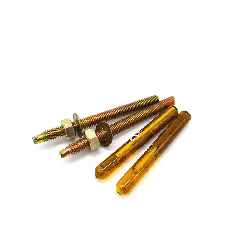 Анкерные болты с гайкой изготовлены из углеродистой стали и оцинкованы. Могут иметь класс прочности до 8.8 (для метрических крепежных изделий), в зависимости от модели.