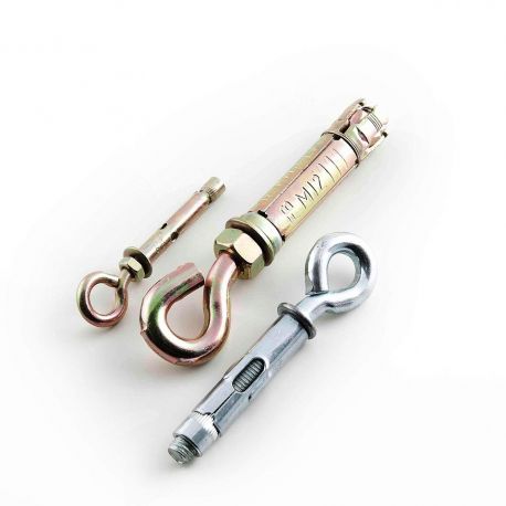 - Применение: анкерные болты с кольцом или крюком применяются для монтажа подвесных конструкций, креплений строительных лесов в бетон, полнотелый кирпич, естественный камень