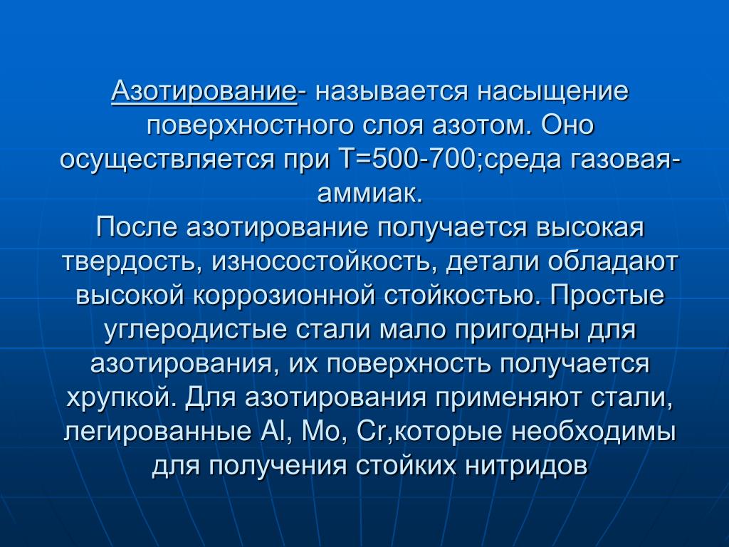 Азотированные стали значительно превосходят по износоустойчивости цементированные и закалённые стали. А. — длительный процесс, для получения слоя толщиной 0,2—0,4 мм требуется 20—50 ч. Повышение температуры ускоряет процесс, но снижает твёрдость слоя. Для защиты мест, не подлежащих А., применяются лужение (для конструкционных сталей) и никелирование (для нержавеющих и жаропрочных сталей). Для уменьшения хрупкости слоя А. жаропрочных сталей иногда ведут в смеси аммиака и азота.