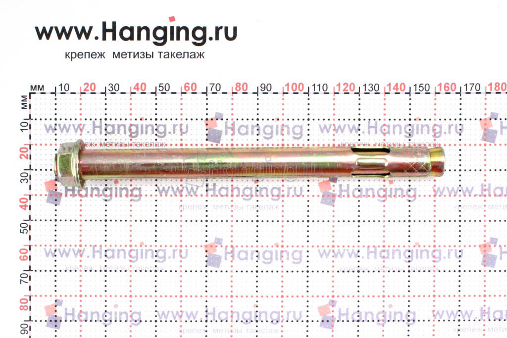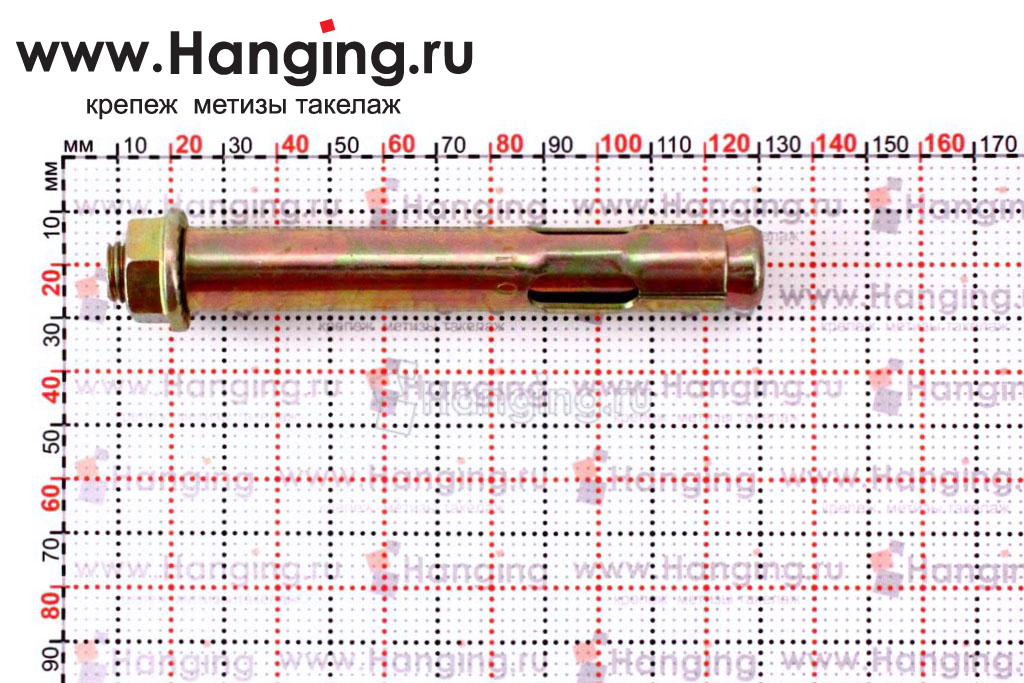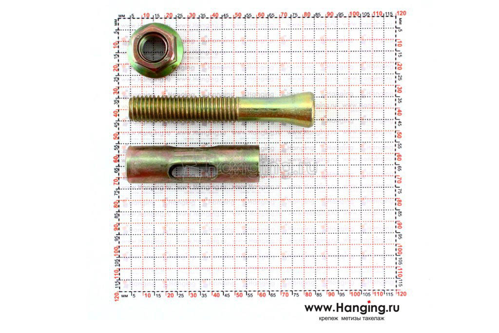Анкер с головкой под шестигранник. Состоит из болта с шестигранной головкой, распорной цанги и гильзы.