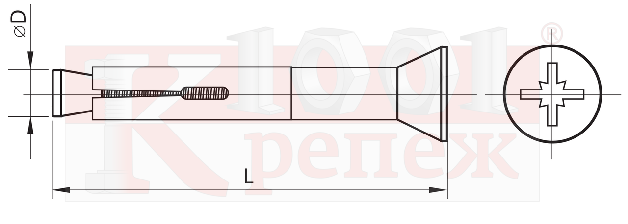 Анкерный болт с потайной головкой предназначен для крепления тяжеловесных конструкций к полнотелому бетону, природному строительному камню, полнотелому кирпичу, к тонким бетонным перегородкам. Часто применяется для крепления дверных блоков, стальных конструкций, облицовочных материалов, где необходимо крепление в потай.