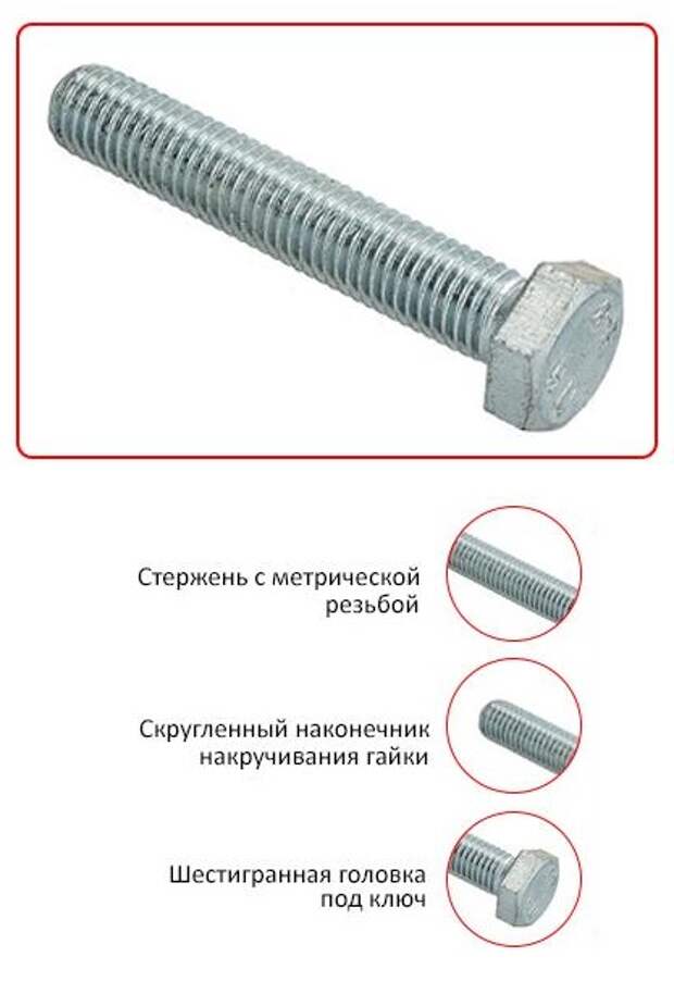 Болт — переводится с английского как «стержень», конструктивно представляет собой металлический стержень с резьбой на конце.