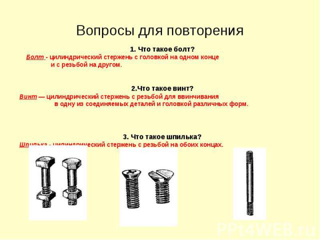Что такое болт? Крепежное металлическое изделие в форме стержня, на одной стороне которого находится головка, а другая сторона имеет наружную резьбу. Если при соединении деталей используется гайка, это соединение называют болтовым.