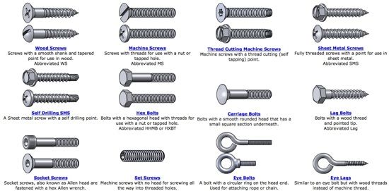 Инструмент зависит от места применения метизов, и способа их монтажа, шляпка винта имеет разную определенную форму. Самые распространенные винты имеют головку с такими формами: цилиндр, полусфера и усеченный конус.