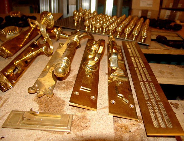 Здесь можно встретить статуэтки животных, людей, птиц, разнообразные панно или рамки для картин или фотографий. При этом поделки могут быть выполнены как в классическом, так и в модернистском стиле. - Дверная и оконная фурнитура. Это дверные ручки и декоративные дверные замки и звонки, оконные ручки или элементы их откосов или наличников. Многие считают, что такие латунные детали придают помещению и зданию в целом изысканный шик и благородство. В эту же категорию относят и накладные замочки, цепочки и щеколды для окон и дверей.