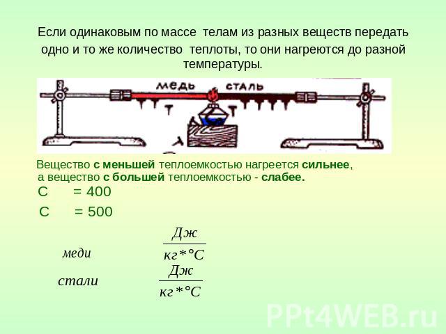 «1 кг алюминия требует в два раза больше энергии для повышения его температуры, чем 1 кг стали. Однако алюминий имеет большую теплопроводность, чем сталь. Если горячую монету положить и на алюминиевую, и на стальную плиту одинаковой массы, какая монета остынет быстрее».