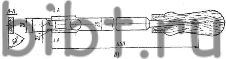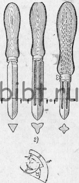 Конструкции шаберов: а — односторонний плоский, б — с загнутым концом, в — двусторонний плоский; г — многогранные; д — углы заточки
