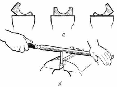 Шабрение плоских поверхностей — наиболее простая технологическая операция. Для выполнения обработки элементов криволинейной конфигурации используется инструмент с более сложной формой его режущей части. Так, части подшипников скольжения обрабатываются при помощи шаберов, имеющих кольцевую конструкцию, а поверхности вогнутой формы — инструментом, который обладает одновременно тремя режущими гранями. Такие инструменты, которые совсем несложно заправить и заточить своими руками, имеют на своей режущей части продольные желобки, а угол заострения их режущей части составляет 60°.