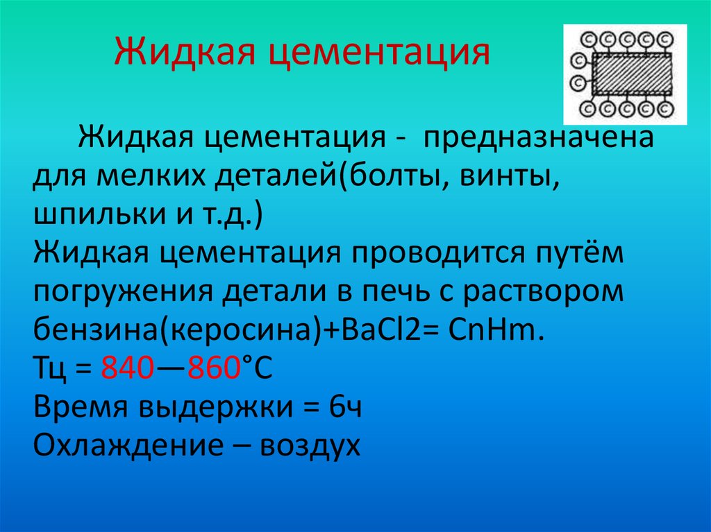 Цементацией называют термообработку металла, в ходе которой для улучшения характеристик материал контактирует с определенной химической средой. Для обработки используется жидкость, газовая смесь или твердый реагент, нагрев которых вызывает выделение свободных атомов углерода.