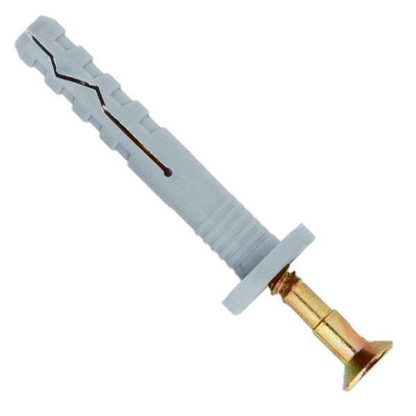 Предназначен для крепления к бетону, полнотелым материалам, кирпичу, пенобетону всевозможных деревянных деталей, включая обрешетку под штукатурку, рамы, стыковочные или штукатурные профили, настенные уголки, а так же кабельные каналы, тонколистовой стали и т.д. Монтаж производится путем забивания распорного стержня (оцинкованного гвоздя с крестовым шлицем на шляпке) в дюбель. Рекомендуется для крепления тонких профилей. Крепление может быть демонтировано или ослаблено при помощи отвертки.