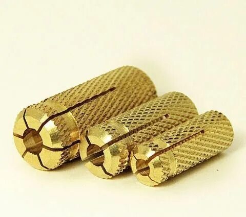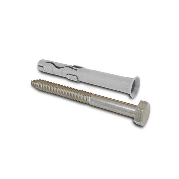 В комплект ударного дюбеля включена разжимная гильза из нейлона с внешним диаметром 6 мм и потайным воротом, а также шуруп из оцинкованной стали длиной 40 мм. В нижней части этой детали имеется стержень с неполной винтовой нарезкой, а сверху шляпка в форме цилиндра с метрической резьбой М6 и ограничителем завинчивания. Половину длины пластмассовой втулки составляет разрезанная вдоль на два сегмента цанговая юбка с распорными гребнями.
