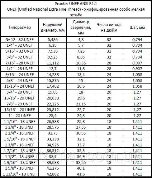Размерный ряд стандартов B.S.F и UNF: 1/4″-28, 5/1б»-24, 3/8″-24, 7/16″-20, 1/2″-20, 9/16″-18, 5/8″-18, 3/4″-16, 7/8″-14, 1″-12.