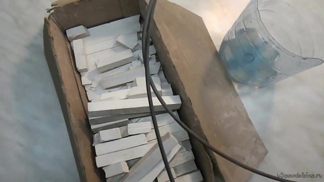 Этих параметров обычно достаточно, но вы можете изменять диаметр и длину по своему усмотрению. Наша основа готова. - Теперь приготовим покрытие. Измельчите мел (желательно обычный белый), и смешайте его с силикатным клеем (иногда в магазинах он называется «жидкое стекло»). Тщательно все перемешайте до однородной консистенции и обмакните в нее алюминиевые прутки.