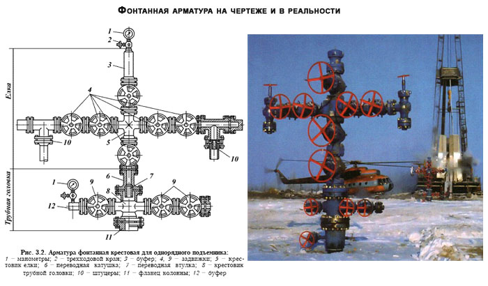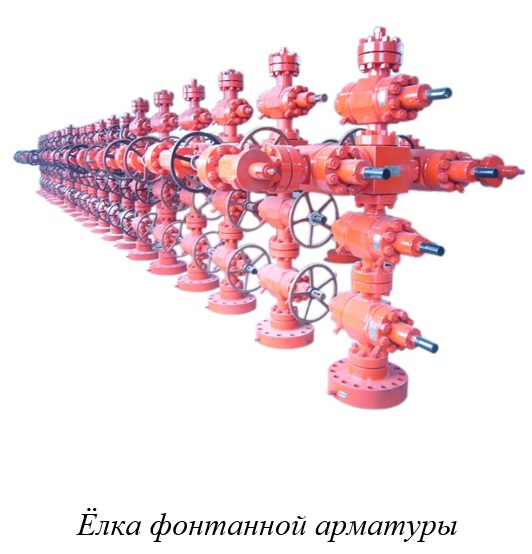 Фонтанная арматура включает трубную обвязку (головку; и фонтанную елку с запорными и регулирующими устройствами.
