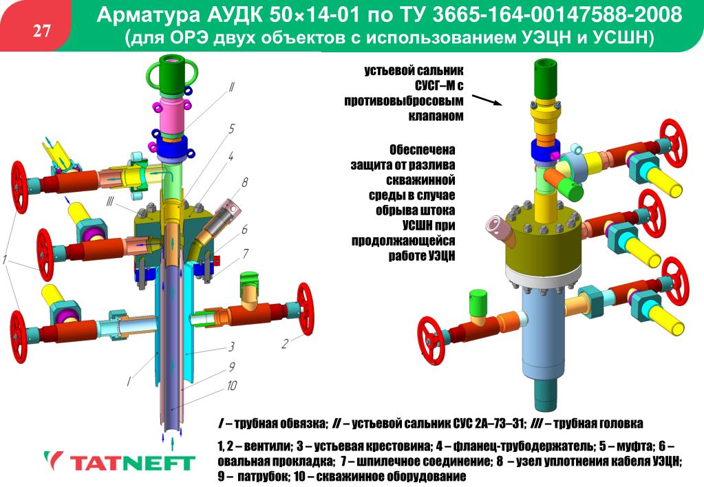 Трубная головка в комплекте с патентованными приспособлениями обеспечивает возможность замены боковых и стволовых задвижек под давлением без остановки добычи, глушения скважины. Поскольку остановка скважины обходится на порядок дороже в сравнении с ценой самого запорного устройства. Минимальный ресурс запорной устьевой арматуры составляет 10 лет.