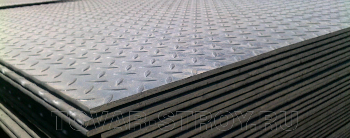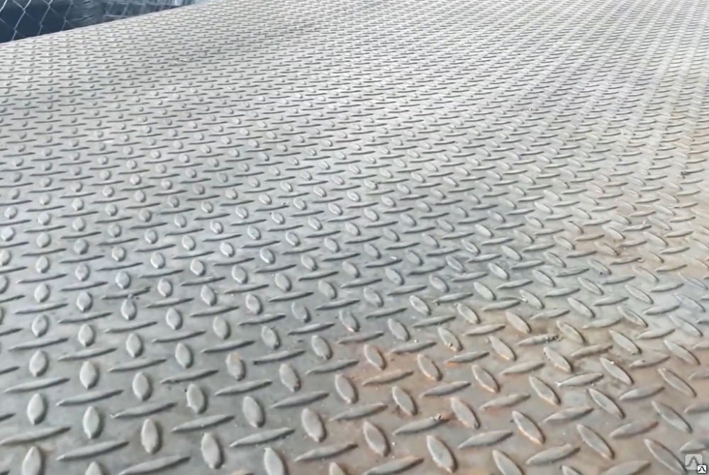 Стальной рифленый лист с ромбическим и чечевичным рифлением, изображенный на фото в данной галерее картинок, а также всевозможные виды металлопроката и труб продаются в компании Сталь-МТ от одной штуки.