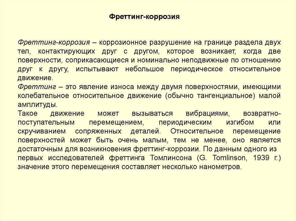 Фреттинг-коррозия – коррозионное разрушение на границе раздела двух тел, контактирующих друг с другом. Эти поверхности, находясь под воздействием коррозионной среды, двигаются (скользят) относительно друг друга. Т.е. фреттинг-коррозия – коррозия при трении. Чаще всего скольжение имеет колебательный характер, а объекты испытывают дополнительную достаточно большую нагрузку.