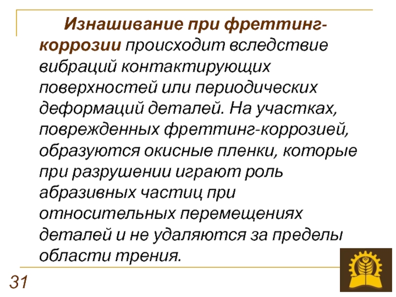 Фреттинг представляет собой сочетание абразивного и адгезионного износа, при котором при приложении нормальной нагрузки возникают адгезионные соединения, а колебательное движение вызывает разрыв материала в виде осколков.