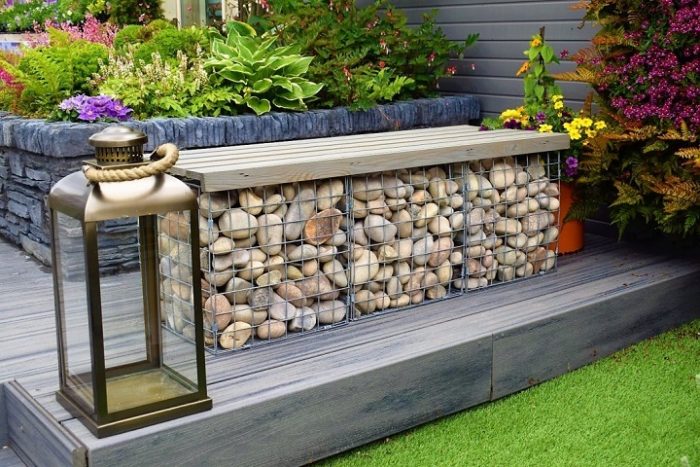 Если для наполнения внутренней части вы решили применить материал с мелкой фракцией, следует использовать геоткань, чтобы небольшие элементы не высыпались наружу сквозь камни крупного размера. Материалы разного типа можно комбинировать, это позволит вам создать красивые композиции. При строительстве опор можно частично совмещать габионы с бетоном, древесиной, кирпичом и прочим. Это касается и других объектов, которые могут быть размещены на территории. Фантазия в данном случае ограничивается лишь бюджетом.