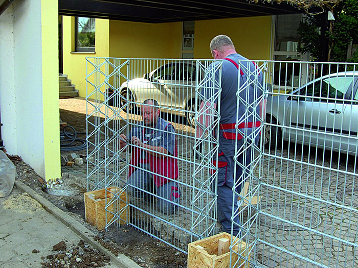 габион. Если вам нужна более высокая стена, установите сверху дополнительный набор корзин.