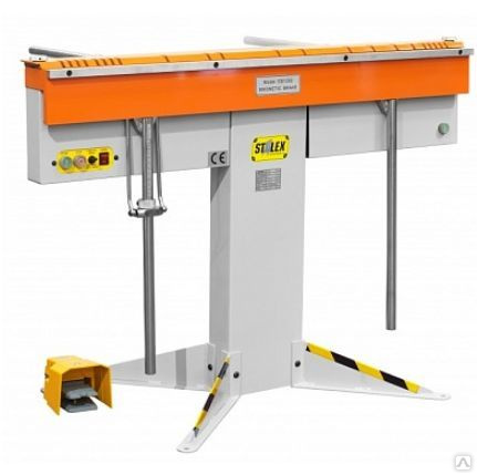 Принцип работы этой конструкции заключается в закреплении заготовки на рабочем столе прижимным устройством и последующего изгиба её поворотной балкой. На таком станке можно добиться угла загиба максимально 135°, а затем произвести изгиб до 180°. В зависимости от мощности прижимной рамы устанавливается и толщина металлического листа.