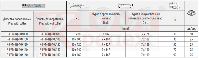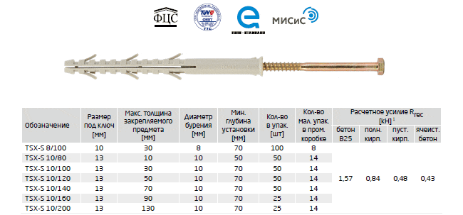 Диаметр шурупов и винтов от М4 до М10, длина дюбеля от 50 до 70 мм..