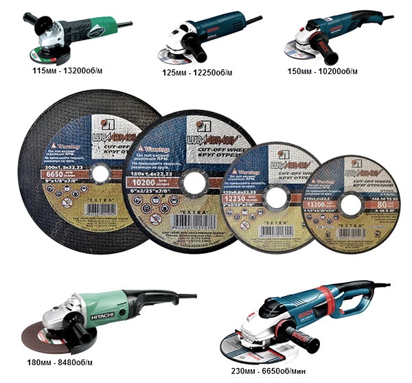 Для УШМ используются диски диаметром: 115, 125, 150, 180 или 230 мм. Практически способна резать только часть диска, выступающая за пределы корпуса болгарки.