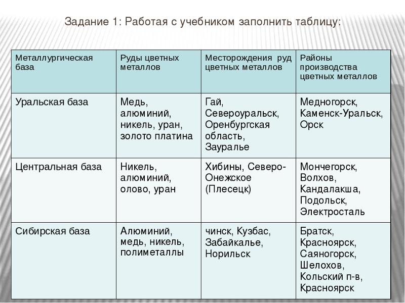Таблица “География цветной металлургии”