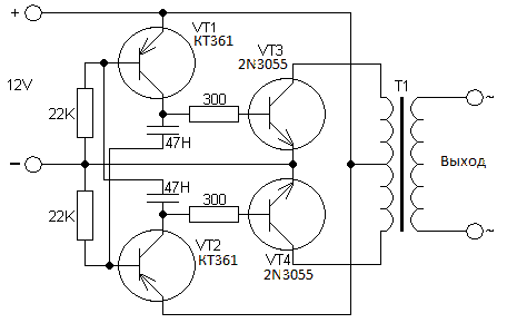 Транзисторы VT4 и VT3 должны быть установлены на радиаторы, обеспечивающие надежный отвод тепла. Мощность такого инвертора составит порядка 60 Ватт, что ограничивается током коллектора транзистора КТ805 (5А), то есть 12 вольт *5 = 60 Ватт. Для повышения мощности инвертора, необходимо подобрать более мощный трансформатор и другой транзистор (например КТ819 у которого ток коллектора в два раза больше, то есть мощность инвертора составит 120 Ватт), либо собрать «составной» транзистор из нескольких.