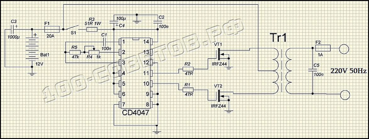 Рис. 1 Принципиальная электрическая схема автомобильного инвертора, 12 вольт на 220 вольт.