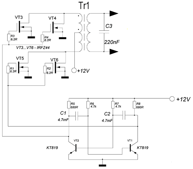 На выходе мультивибратора включен инвертор на D1.4, который создает противофазные сигналы, для каждого из транзисторов (VT1 и VT2), затем следует двухтактный усилитель мощности на транзисторах VT3 и VT4. Транзисторы нагружены на низковольтную обмотку повышающего трансформатора T1. Каждая из первичных обмоток пропускает ток с частотой 100 Гц, но так как обмотки две, и работают они в противофазе, то на вторичной обмотке получается частота напряжения 50 Гц. Конденсатор С4 дополнительно сглаживает напряжение, что приближая его к синусоидальному напряжению.