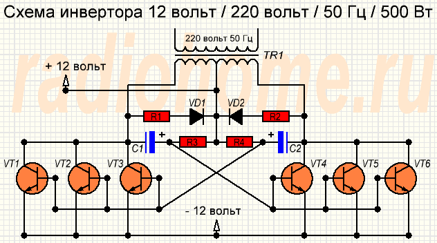 Вначале мы расскажем о принципе работы инвертора, а затем и приведем принципиальную электрическую схему с маркировкой и номиналом примененных в ней радиоэлементов.