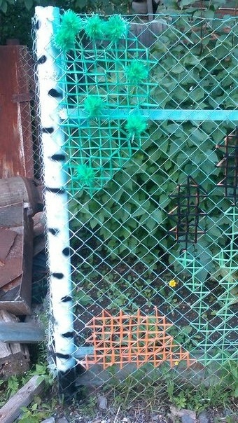 Поскольку заборы из звеньев цепи позволяют вставлять длинные узкие детали вертикально, почему бы не сделать из этого целый забор? В этом и заключается идея этого классического метода украшения заборов из звеньев сетки.