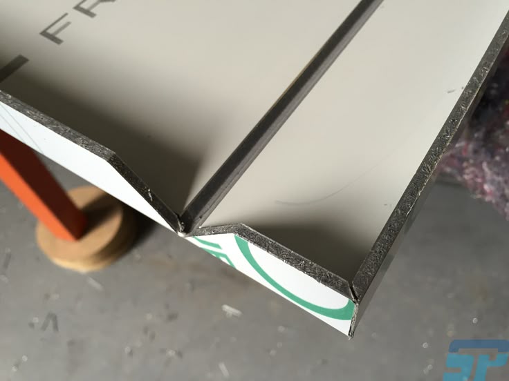 Поэтому гибка листового алюминия композиционных составов производиться методом выборки паза в месте гиба. Для этого на листе закрепляют направляющие и, с помощью специального ручного инструмента фрезера, прорезают паз как минимум на 2/3 глубины с углом развертки от 90 до 110 градусов, что дает возможность сгибать алюминиевый лист под углом 90 градусов без потери целостности.
