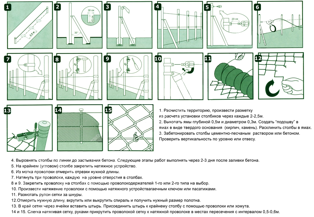 Сетку крепят между опорными столбами, которые могут быть металлическими, асбест-цементными или деревянными.