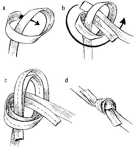 Чтобы завязать этот узел, трос укладывают в виде двух одинаковых по размеру петель. Обе петли обносят несколько раз ходовым концом троса, после чего этот конец пропускают в петлю, обращенную к коренной части троса, и, вытягивая крайнюю петлю, зажимают в ней. Затягивающуюся удавку всегда можно без труда развязать, если потянуть за коренную часть троса.