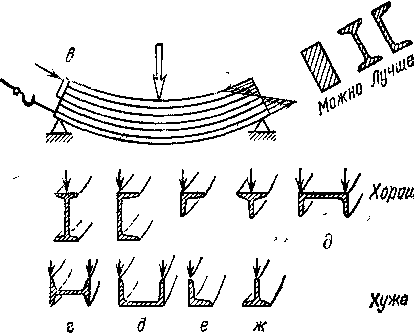 Тот же недостаток, но в меньшей степени, присущ конструкции, приведенной на рис. 77, II. Здесь внецентровой изгиб возникает вследствие асимметрии сечения стержня относительно направления действия сил. Рациональной является конструкция с симметричными относительно нагрузки сечения (рис. 77, III). В этом случае нагрузка приводится к одному сжатию при прочих равных условиях масса конструкции наименьшая.