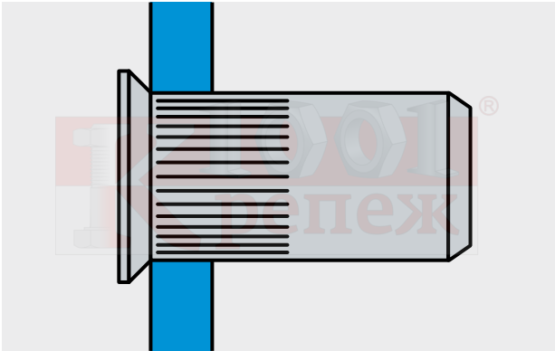 Принцип работы резьбовых заклепок заключается в том, что после установки такого запорного элемента создаётся резьба. В которую потом вкручивают винт или болт.