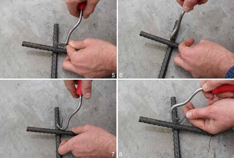 Выполняется «своими руками» при помощи стального крюка с деревянной или пластиковой ручкой. Самый распространенный узел, с помощью которого можно связать стальные арматурные стержни, производится следующим образом: