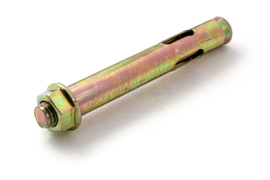 - Анкерный болт с гайкой. Устроен такой крепеж очень просто и состоит он из трех частей. Это винт, на конце которого заместь привычной головки под отвертку или шестигранник расположено конусное утолщение, железная трубка с прорезями на одном из кончиков и конкретно сама гайка, которая в процедуре навинчивания на винт втягивает его конусный край вовнутрь трубки, таким образом разжимая ее и распирая в отверстии.