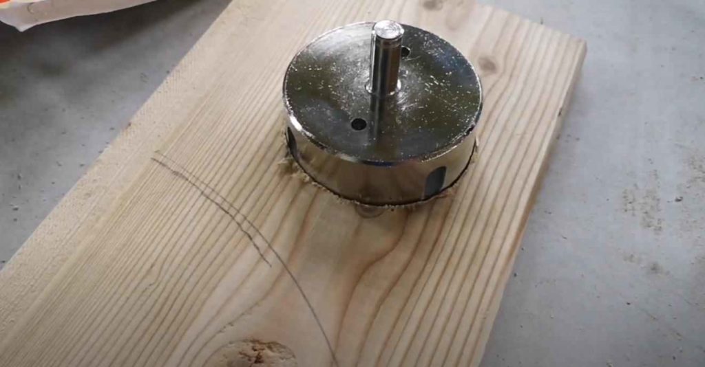 - Через каждые 2-3 мм берите тонкое сверло и делайте маленькие отверстия по тому кругу, что сделала коронка. Это делается для того, чтобы зубья коронки могли зацепиться за края круга и продолжать работу.