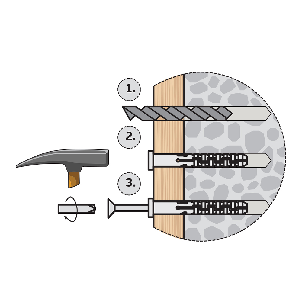 С задачей справляются дюбель-гвоздь, представляющий собой крепёжную пару. Один из плюсов его использования – скорость монтажа (наименование «дюбель быстрого монтажа»). Последовательность крепления следующая:
