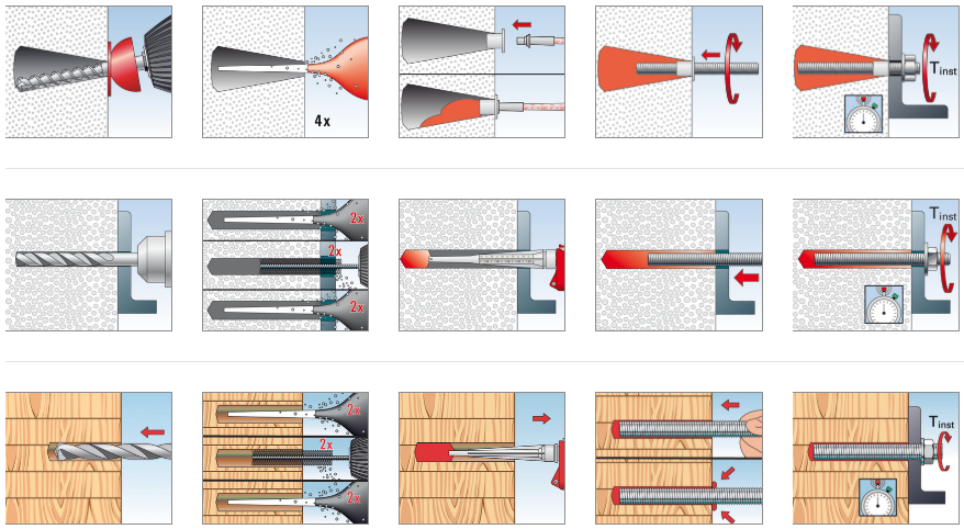 Монтаж стандартный — высверливают отверстие, очищают его, вставляют анкер с навешенной деталью и слегка подбивают. Остается закрутить анкерные болты на несколько оборотов — гайка конусом входит в муфту и распирает ее.