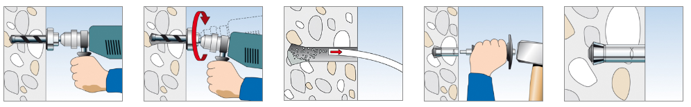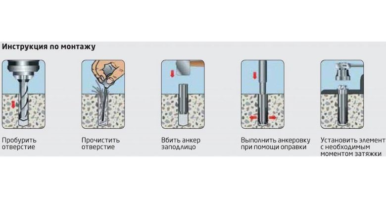 В основании сверлят отверстие под муфту, очищают от пыли. На анкер навешивают деталь, вставляют его в отверстие и несильными ударами молотка забивают до упора. Затем затягивают гайку на несколько оборотов.