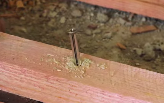 Монтаж, как крепить анкерный болт — в отверстие основания надо забить анкерный болт, в который в свою очередь вбивают гвоздь.