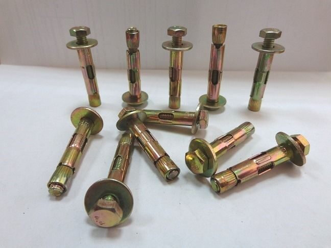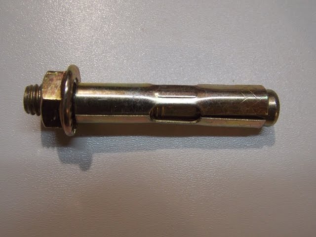 Втулочный анкер состоит из четырех частей: болта с резьбой и металлической втулки с большими прорезями и узкими поперечными разрезами, а также гайки и шайбы. Прорези и прорези позволяют втулке расширяться при затягивании болтом. Кроме того, гладкий клин в нижней части болта с резьбой тянет вверх, заставляя нижнюю часть втулки расширяться.