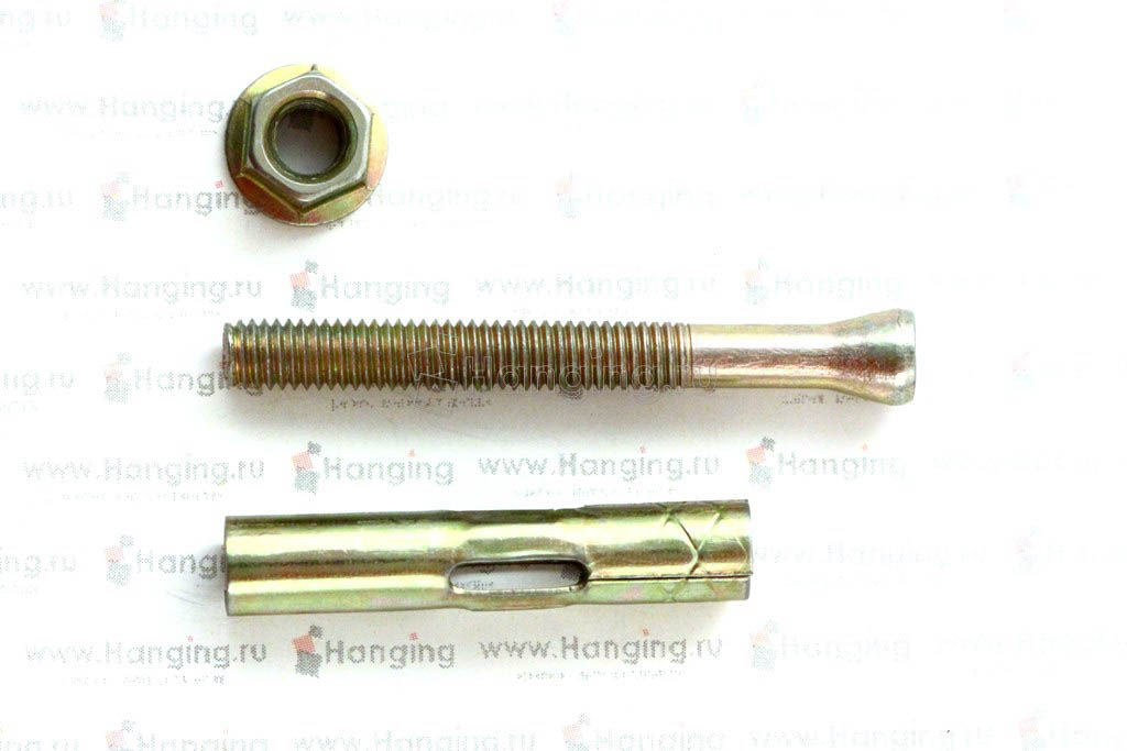 Это классический болт с шайбой, который вкручивается в муфту с продольными прорезями на конце. В качестве распорного элемента служит хвостовая конусообразная гайка.