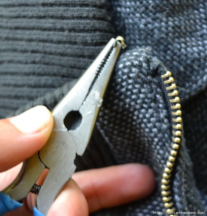 5. Теперь молнию нужно отрезать определённым образом (см. фото). Края среза лучше подпалить, например, зажигалкой.