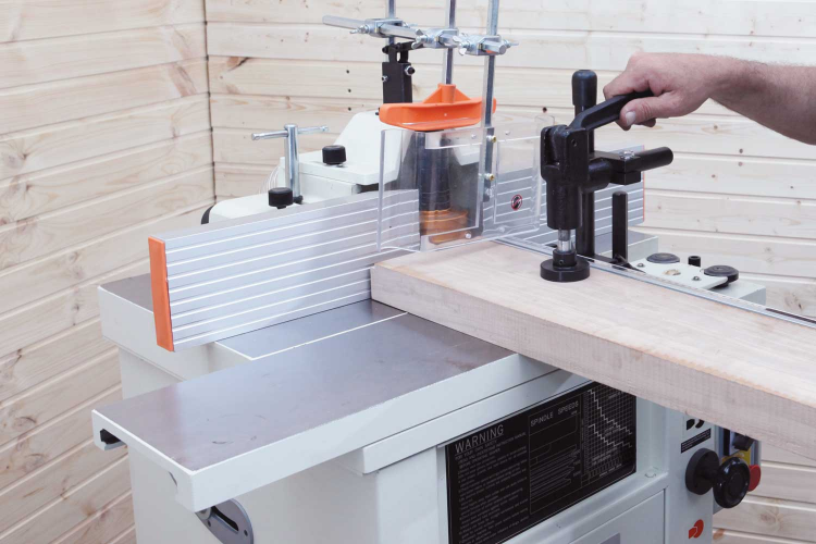 - Устройства с верхним местоположением шпинделя. В конструкцию изделий входят: станина со столом и хоботом в задней части. Шпиндель вращается при помощи клиноременной передачи. Рабочий стол устройства оснащен направляющей линейкой. В вырезе стола находится приводной обрезиненный приводной ролик, а в другой части неприводной ролик, который прижимается к первому педалью.